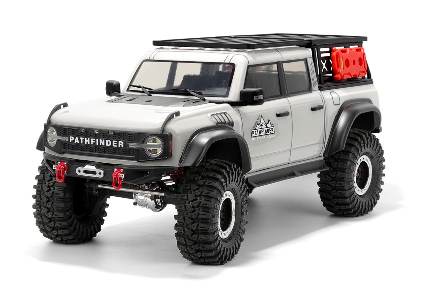 Pathfinder, a totally new 1/10 cralwer, RGT will launch in November 2024. The model number is EX86150. Basing on LC76 chassis platform, Pathfinder aims to build a long wheelbase rock crawler. With long wheelbase, the vehicle will have less transmission jerk and better movement curves in driving posture. The "Pathfinder" features  front and rear integrated portal axle structure, front and rear differential lock function,  and two-speed reverse transmission case. The "Pathfinder" use simulated pickup truck appearance, which makes the overall center of gravity relatively lower and provides a larger approach angle for the vehicle. It comes with a 1.5MM thick PC material body and simulated interior. Equipped with multi-function nylon luggage rack, it can freely match different outdoor realistic equipments according to players' needs. Considering the needs of players who want to cross through heavy loads, Pathfinder comes with 80A high-power ESC that is only used for 1/8 cars,  7.4V BEC output, and RC550 motor. Pathfiner comes with multi-mode linked LED light group,  8-channel 2.4G remote controller as standard configuration. It has 4 high-pressure metal gear servos, including a 30KG high torque steering servo.