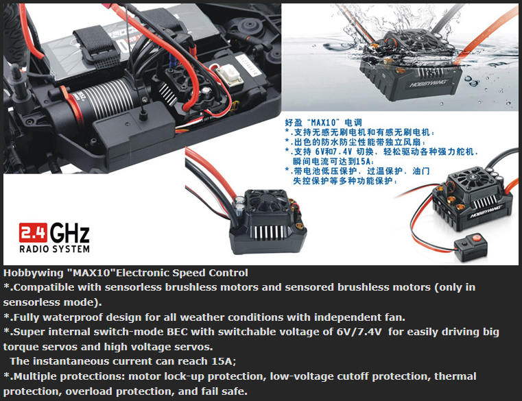 📍 Specs📍 Brand : 鴻諾 Hong Nor Model No. : Mars Pro H9801 Scale : 1:10 Motor : Hobbywing 3652 3300kv Brushless Motor ESC : Hobbywing WP-MAX10 80A Waterproof Electric Speed Control (support 2/3S LiPo) Battery : 7.4V 3800mah LiPo 30C Charging Time: 4-5hours Play Time: 10-15mins Remote Control : 2.4Ghz 2 Channel Remote Control Charge : 7.4v USB Charge Servo : 15KG Metal Gear Servo Size : 495 x 305 x 185 mm Wheelbase (mm): 280 mm Track width (mm): 140 mm Ground clearance (mm): 60 mm Wheel diameter (mm): 135 mm (diameter) / 55 mm (width) Gear ratio: 1:9.8 Total weight including packaging: 2680 grams Packaging dimensions: 610 mm x 340 mm x 235 mm 📍 Hobbywing 80A Waterproof Electric Speed Control 📍 Model: EZRUN-WP-MAX10-SCT-RTR Voltage Support: 7.4V – 11.1V (2-3 cell LiPo) Current Ratings: 80A (continuous), 500A (peak) Motor Compatibility: Sensorless brushless motors (can also be used with sensored motors, but does not support sensored drive mode) EC Output to Receiver Current: 6.0V 3A (MAX 6A) 📍 Spec. 📍 ⚙ Scale: 1:10 remote-controlled brushless motor monster truck (RTR version, ready to run) ⚙ Equipped with: 2.4GHz remote control and receiver to prevent interference and ensure responsive control ⚙ Receiver features: Anti-fail safe protection—automatically stops the RC car when there’s no signal or low battery to prevent loss of control ⚙ Hobbywing 80A Waterproof Brushless ESC: Equipped with 3.0V low-voltage protection to prevent over-discharge of LiPo batteries ⚙ Waterproof design: Suitable for light splashing and wet conditions ⚙ High-quality metal oil-filled shock absorbers: Provide excellent shock absorption; independent suspension on all four wheels for stability during movement ⚙ Wheelie bar design: Prevents flipping during high-speed acceleration; allows for aggressive wheelies ⚙ Large off-road tires: Suitable for various terrains, providing strong traction ⚙ 15KG metal gear high-torque servo: Precise and high-performance steering ⚙ Four-wheel drive ⚙ High-energy front and rear differential system configuration ⚙ Sturdy suspension arms and front/rear shock plates ⚙ All-metal gears and ball bearings ⚙ Large front bumper for impact protection 📍 What's Included📍 ☑ Hong Nor 1:10 Monster Truck Blue Mars Pro H9801 * 1 set ☑ 7.4V 3800mAh LiPo 30C Battery * 1 pc ☑ 7.4v USB Charge * 1 pc ☑ 2.4GHz Remote Controller * 1 pc ☑ User Manual * 1 pc ☑ Colorful Box Packaging * 1 pc