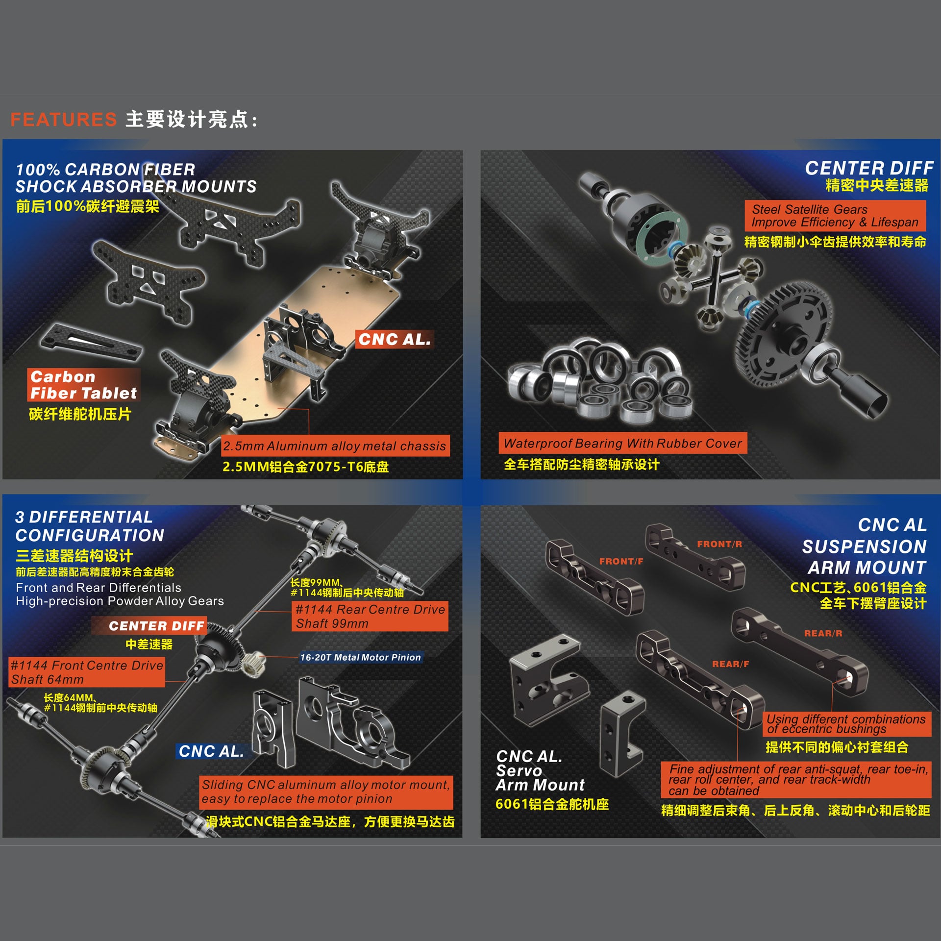 📍產品規格📍 商品新舊 : 全新 品牌 : 鴻諾 Hong Nor 型號 : FOXHOUND H9804 無刷拉力車 馬達 : 3652 4000KV 無刷馬達 電子變速器 : 好盈 Hobbywing WP-10BL60-RTR 60A 防水無刷電變 (支援7.4V - 11.1V LiPo) 遙控及接收器 : 2.4Ghz 4通道遙控及接收 (遙控距離約120米, 可限速) Servo : 9KG 金屬齒輪Servo 尺寸 (約) (長x闊x高) (mm) : 445 x 190 x 145 mm 軸距 (mm) : 260 mm 離地距離 (mm) : 12-20 mm 輪徑 (mm) : 72mm (直徑) / 25mm (闊) 齒輪比 : 6.5:1 重量 : 1.6kg 包裝尺寸 : 📍 Hobbywing 60A防水電變規格 📍 型號 : WP-10BL60-RTR 支援電壓 : 7.4V – 11.1V (2-3cell LiPo) 電流數值 : 60A (持續), 360A (峰值) 支持馬達 : 無感無刷馬達 (也可使用有感馬達, 但不支持有感驅動模式) EC輸出到接收器電流 : 6.0V 3A 📍特點📍 ⚙ 1:10 全比例遙控無刷FOXHOUND H9804 無刷拉力車 ⚙ 配備 2.4Ghz 遙控及接收, 避免因干擾而影響遙控反應 ⚙ 接收器備有防失控保護, 在遙控沒訊號 或 沒電時, 遙控車會自動停頓, 以防失控 ⚙ 好盈 Hobbywing 60A 防水無刷電變, 備設3.0V低電壓保護, 避免LiPo充電池過放 ⚙ 電變防水設計, 一般濺水也不會壞 ⚙ 高品質金屬油壓避震器, 具備良好的防震功能. 4輪獨立避震, 令車在行走時更穩定 ⚙ 配備9KG 金屬齒輪大拉力Servo, 高精度, 高性能 ⚙ 四輪驅動 ⚙ 高情能前後差速系統配置 ⚙ 全車金屬齒輪 及 金屬滾珠軸承 ⚙ 超大前防撞架, 具備良好的防撞性能 ⚙ 金屬底盤 📍包裝內容📍 ☑ 鴻諾 Hong Nor 1:10 FOXHOUND H9804 無刷拉力車 * 1 set ☑ 2.4Ghz 遙控器 (用4粒2A電) * 1 pc ☑ 說明書 * 1 pc ☑ 彩盒包裝 * 1 pc * 官方出廠不包含 "遙控車電池 及 充電器 "