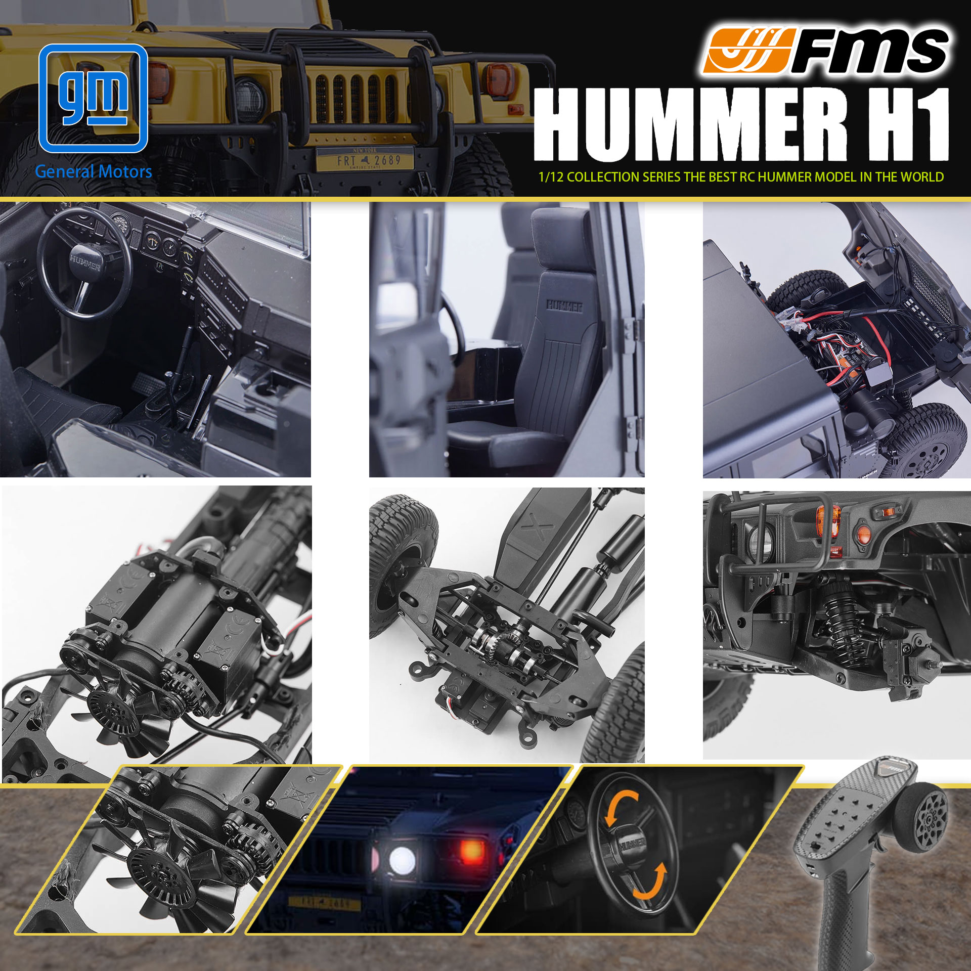 全新 🌟 FMS 🌟 1:12 GM HUMMER H1 攀爬車 | 2.4Ghz 遙控 | 2/4輪驅動 | 20粒燈 | 4輪轉向 | 機械變速波箱 | 差速鎖 | 黃色