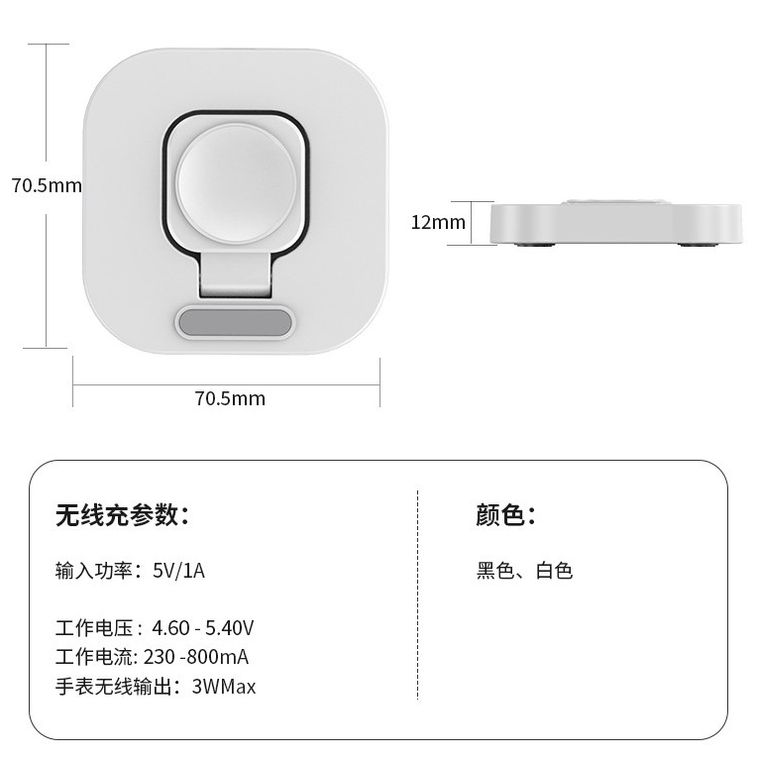 📍 產品規格 📍 商品新舊 : 全新 型號 : Apple Watch 座枱式USB充電器 充電接口:Type C / 可反插USB 磁吸定位:有 兼容性:Apple Watch 1 - 8 代 最大功率 : 3W 輸入電壓/電流:DC5.0V/1.0A 重量 : 20g 尺寸 : 70.5 * 70.5 * 12mm 包裝尺寸 : 75 * 90 * 17mm 產品連包裝重量 : 30g 📍 包裝內容 📍 ☑ Apple Watch 座枱式USB充電器 * 1pc ☑ Type C 線 * 1pc ☑ 包裝盒 * 1pc