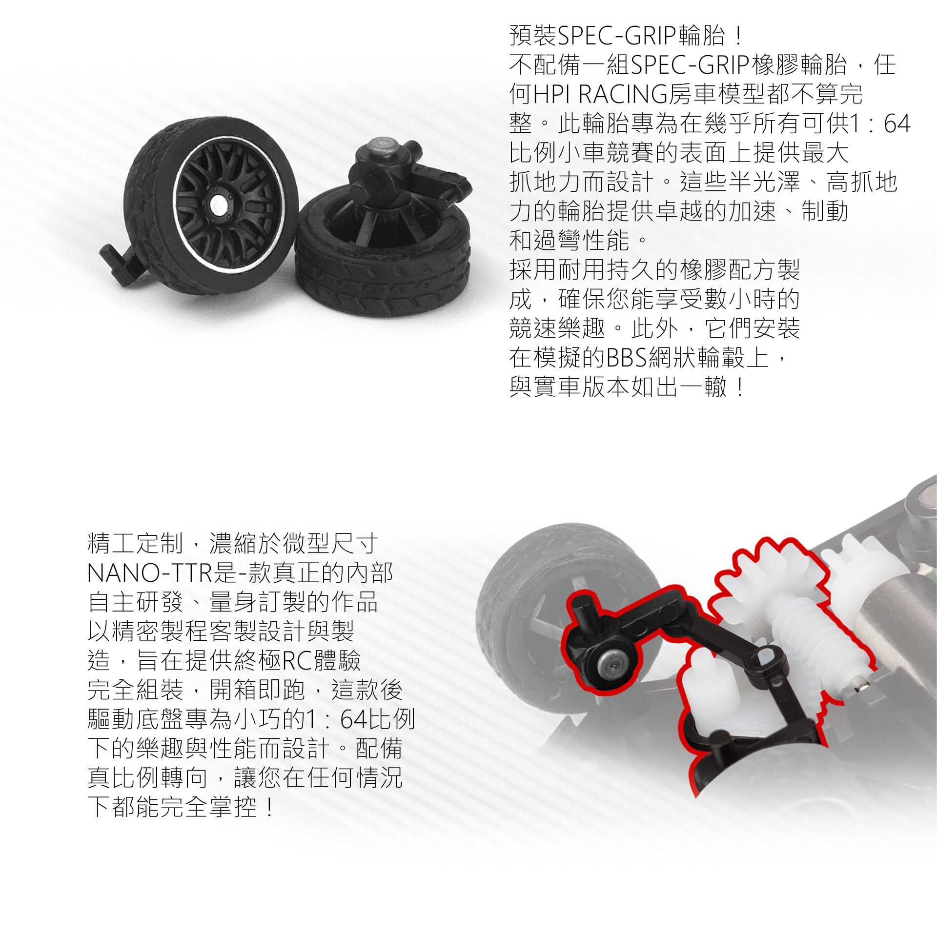 📍 特性 📍 ⚙ 工廠組裝並預塗裝完成的電動 2WD 1/64 比例房車 ⚙ 手工塗裝完成,官方授權的BMW RTR-X 硬殼 ⚙ 獨特的 1/64 比例全授權無卡扣車殼安裝系統 ⚙ 全比例「Real Steer」回歸 ⚙ 45 分鐘續航 ⚙ 微型 1/64 比例 WORK MEISTER S1 輪圈 ⚙ 搭配 HPI Racing SPEC-GRP 溝紋輪胎 ⚙ 全功能 LED 燈,包括前燈、尾燈、倒車燈與轉向燈 ⚙ RTR 套裝包含 USB 充電線 ⚙ HPI MTX-400 2.4GHz 無線電系統 ⚙ 內含 85mAh 3.6V 鋰聚合物電池 📍 規格 📍 尺寸 - 長度:70mm - 寬度:32mm - 高度:24mm - 軸距:42mm 重量 - 運行重量:22g 📍 包裝內容 📍 ☑ 1989 BMW M3 Ravaglia RTR * 1 pc ☑ MTX-400 2.4GHz 遙控器 * 1 pc ☑ USB充電線 * 1 pc ☑ 彩盒包裝 * 1 pc