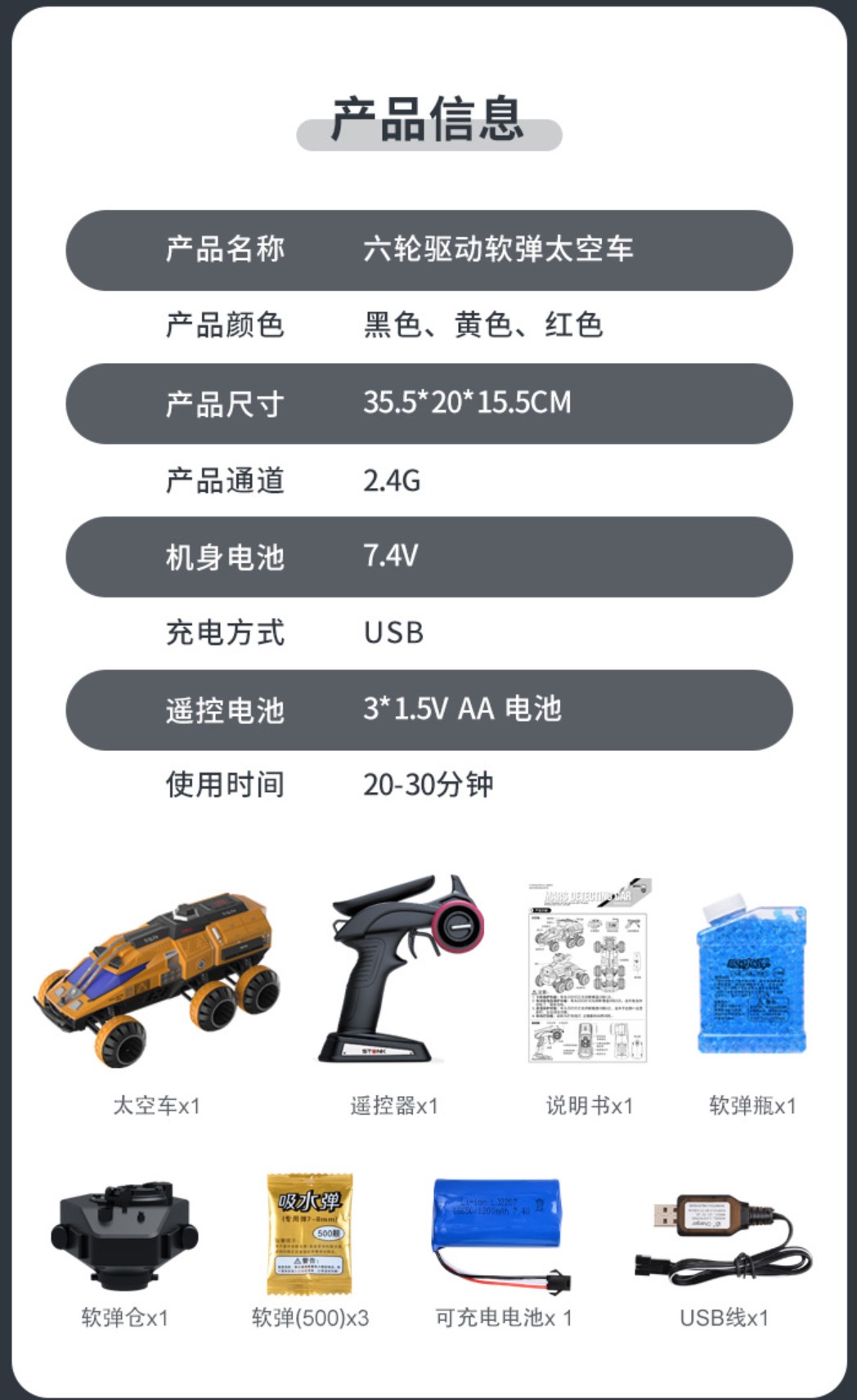 全新 JJRC 1:12 六輪太空火星深測車 | 2.4Ghz 全比例遙控 | 六輪驅動 | 升降炮台 | 發射水彈 | 聯動車燈 | 黃色 / 黑色 / 紅色